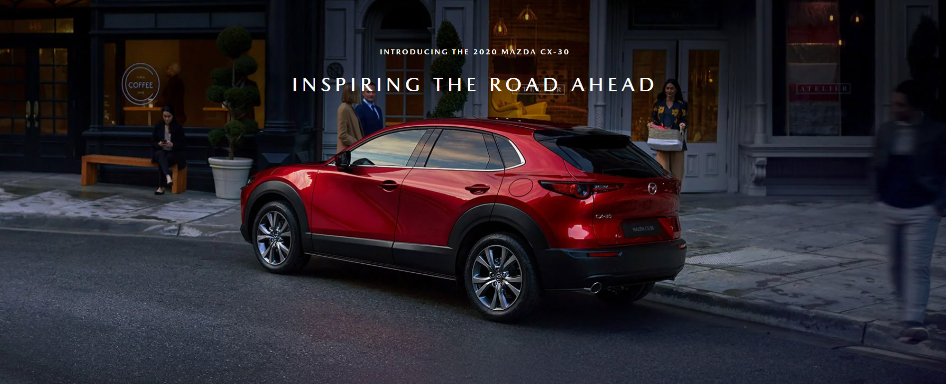 Tampilan depan Mazda CX-30 berkarakter dengan desain KODO khas Mazda yang memberi kesan elegan. Gril yang berukuran besar dipadu lis berwarna silver pada bagian bawah dan menyambung hingga lampu utama. Lampu LED sudah disematkan pada Mazda CX-30. Bentuk lampu yang pipih dan sudah mengadopsi teknologi LED diklaim membuat Mazda CX-30 mempunyai penerangan lebih baik